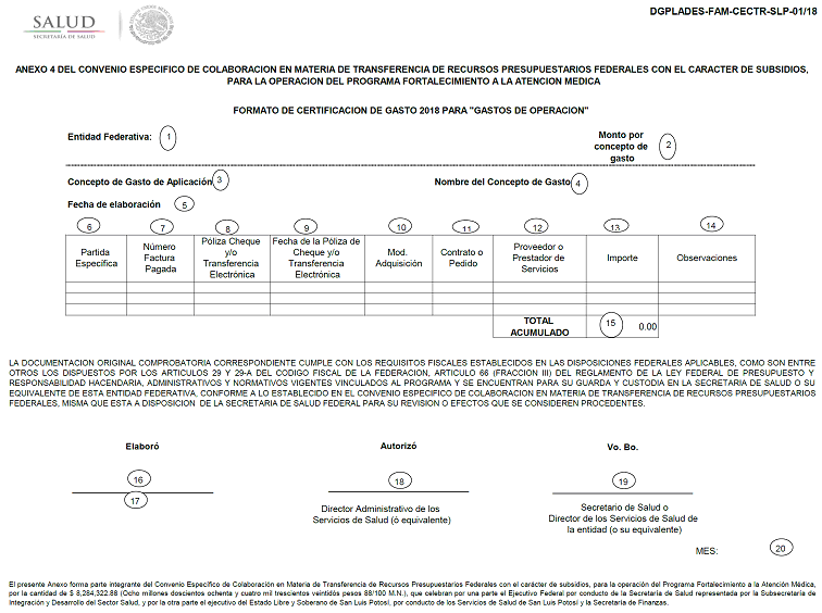 | 35501 | MANTENIMIENTO Y CONSERVACION DE VEHICULOS TERRESTRES, AEREOS, MARITIMOS, LACUSTRES Y FLUVIALES. | Asignaciones destinadas a cubrir el costo de los servicios de mantenimiento y conservación de unidades médicas móviles federales del Programa FAM y su planta de luz o de emergencia. |