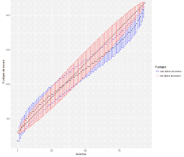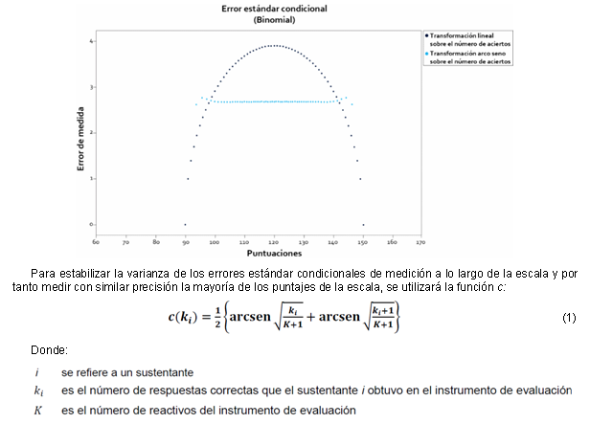 Se observa que al aplicar la transformación doble arcoseno se mide con similar precisión la mayoría de los puntajes de la escala, a diferencia de cuando no se aplica dicha transformación, además de que en el punto de corte para alcanzar el nivel de desempeño II (100 puntos) el error es menor cuando se aplica la transformación.