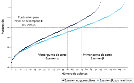 La puntuación mínima aceptable que los sustentantes deben tener para ubicarse en el nivel de desempeño II (N II) en los instrumentos de evaluación, se ubicará en el valor 100. Para determinarla se empleará la siguiente ecuación: