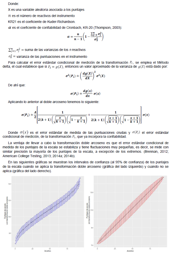 El dato obtenido del error estándar condicional deberá reportarse en la misma escala en que se comunican las calificaciones de los sustentantes e incorporarse en el informe o manual técnico del instrumento (estándar 2.13 de los Estándares para las Pruebas Educativas y Psicológicas de la American Educational Research Association et. al., 2014). Asimismo, esto permite atender al estándar 2.14 de los Estándares para las Pruebas Educativas y Psicológicas de la American Educational Research Association et. al., 2014, el cual establece que cuando se especifican puntos de corte para selección o clasificación, los errores estándar deben ser reportados en la vecindad de cada punto de corte en dicho informe o manual técnico.