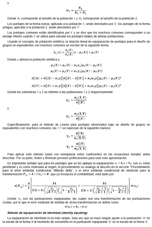 La equiparación de las formas de un instrumento deberá realizarse utilizando el método de equiparación lineal de Levine (Kolen y Brennan, 2014), para puntajes observados bajo un diseño de grupos no equivalentes con reactivos comunes. Dicho diseño es uno de los más utilizados en la práctica. En cada muestra de sujetos se administra solamente una forma de la prueba, con la peculiaridad de que en ambas muestras se administra un conjunto de reactivos en común llamado ancla, que permite establecer la equivalencia entre las formas a equiparar.