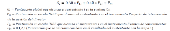 Una vez que se ha verificado que el sustentante presentó los dos instrumentos que constituyen las etapas 2 y 3 del proceso de evaluación y que obtuvo al menos NII en por lo menos uno de ellos, se procede a calcular la puntuación global con base en el siguiente esquema: