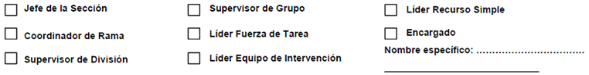 | Nombre del responsable bajo su cargo: | Posición a desempeñar: | Asignación Táctica: | Ubicación: | No. Personas a cargo: | Observaciones: |