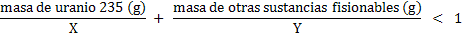 | Sustancias fisionables | Masa de sustancias fisionables mezclada con sustancias de una densidad media de hidrógeno inferior o igual a la del agua g | Masa de sustancias fisionables mezclada con sustancias de una densidad media de hidrógeno superior a la del agua g |