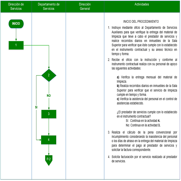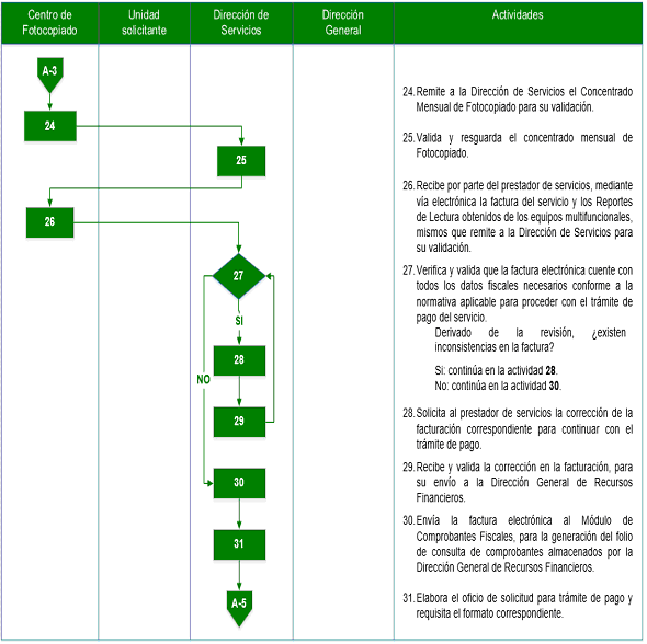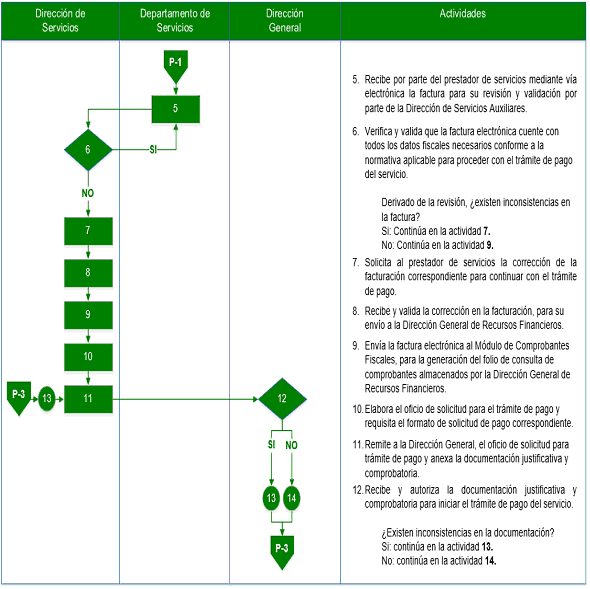 | Dirección de Servicios | 28. Solicita al prestador de servicios la corrección de la facturación correspondiente para continuar con el trámite de pago. | Factura electrónica |