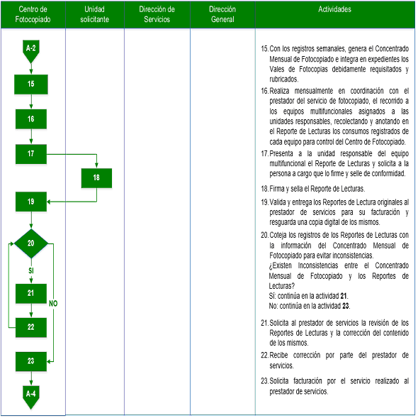 | Centro de Fotocopiado | 14. Registra en el Concentrado Semanal de Equipos de Fotocopiado la lectura anterior de consumos y acude a las diversas áreas que tienen asignado equipo de fotocopiado, a fin de tomar la lectura de los mismos para registrar en el formato del Centro de Fotocopiado la lectura para su control. | Vale de Fotocopias / Formato de Concentrado Semanal de Equipos de Fotocopiado (ANEXO 4) / Formato de Concentrado Semanal del Centro de Fotocopiado (ANEXO 5) |