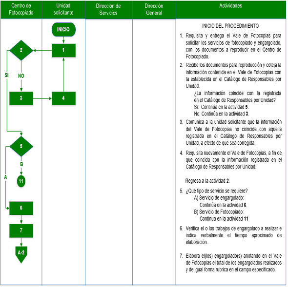 | Centro de Fotocopiado | 5. ¿Qué tipo de servicio se requiere? A) Servicio de engargolado: Continúa en la actividad 6. B) Servicio de Fotocopiado: Continua en la actividad 11. | Vale de Fotocopias |