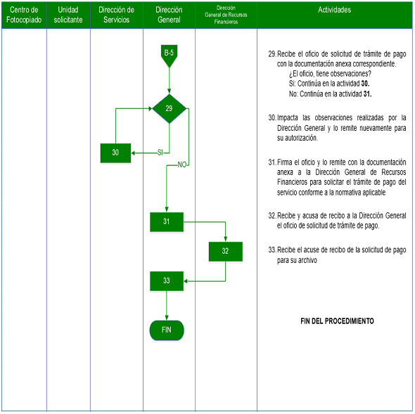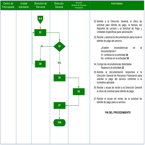 | Dirección de Servicios | 32. Remite a la Dirección General, el oficio de solicitud para trámite de pago, la factura, los Reportes de Lectura y la Solicitud de Pago y Unidades Específicas para autorización. | Oficio y formato de solicitud de pago / Factura / Reportes de Lectura |