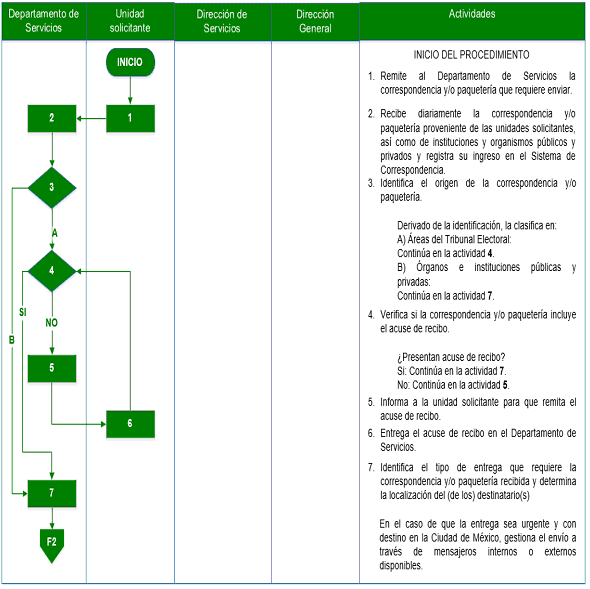 | Departamento de Servicios | 3. Identifica el origen de la correspondencia y/o paquetería. Derivado de la identificación, la clasifica en: A) Áreas del Tribunal Electoral: Continúa en la actividad 4. B) Órganos e instituciones públicas y privadas: Continúa en la actividad 7. | Correspondencia y/o paquetería |
