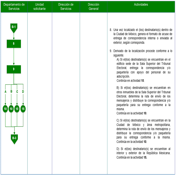| Departamento de Servicios | 9. Derivado de la localización procede conforme a lo siguiente: A) Si el(los) destinatario(s) se encuentran en el edificio sede de la Sala Superior del Tribunal Electoral, entrega la correspondencia y/o paquetería con apoyo del personal de su adscripción. Continua en la actividad 10. B) Si el(los) destinatario(s) se encuentran en otros inmuebles de la Sala Superior del Tribunal Electoral, determina la ruta de envío de los mensajeros y distribuye la correspondencia y/o paquetería para su entrega conforme a la misma. Continua en la actividad 10. C) Si el(los) destinatario(s) se encuentran en la Ciudad de México y área metropolitana, determina la ruta de envío de los mensajeros y distribuye la correspondencia y/o paquetería para su entrega conforme a la misma. Continua en la actividad 10. D) Si el(los) destinatario(s) se encuentran al interior y exterior de la República Mexicana. Continúa en la actividad 15 | Formatos de control de correspondencia interna y externa |
