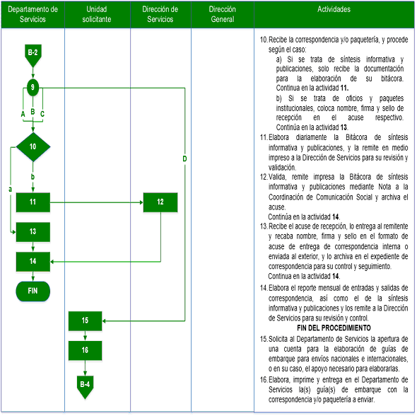 | Departamento de Servicios | 2. Recibe diariamente la correspondencia y/o paquetería proveniente de las unidades solicitantes, así como de instituciones y organismos públicos y privados y registra su ingreso en el Sistema de Correspondencia. | Correspondencia y/o paquetería |
