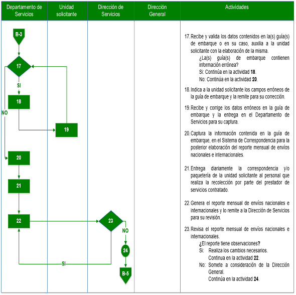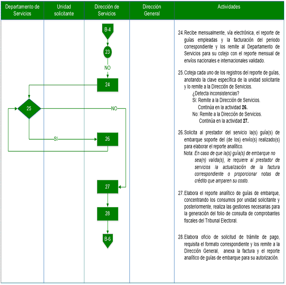 | Dirección de Servicios | 24. Recibe mensualmente, vía electrónica, el reporte de guías empleadas y la facturación del periodo correspondiente y los remite al Departamento de Servicios para su cotejo con el reporte mensual de envíos nacionales e internacionales validado. | Facturas / Reporte de guías / Reporte mensual de envíos nacionales e internacionales |