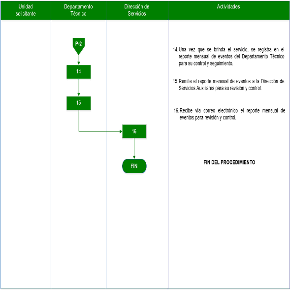 | Departamento de Servicios | 14. Elabora el reporte mensual de entradas y salidas de correspondencia, así como el de la síntesis informativa y publicaciones y los remite a la Dirección de Servicios para su revisión y control. FIN DEL PROCEDIMIENTO | Reporte mensual de entradas y salidas (ANEXO 10) / Reporte mensual de síntesis informativa y publicaciones (ANEXO 11) |