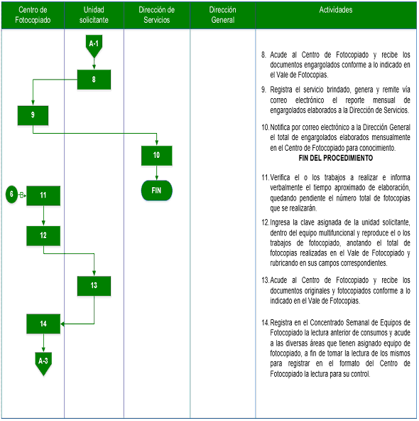 | Unidad solicitante | 8. Acude al Centro de Fotocopiado y recibe los documentos engargolados conforme a lo indicado en el Vale de Fotocopias. | Documentos originales Engargolados |