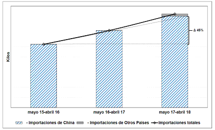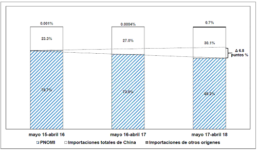 144. En términos del mercado nacional, la Secretaría observó que las importaciones totales aumentaron su participación en el CNA en 3.6 puntos porcentuales en el periodo mayo de 2016-abril de 2017 y 3.8 puntos porcentuales en el periodo investigado, al pasar de 23.3% a 30.8% (27% en el periodo mayo de 2016-abril de 2017). El desempeño de las importaciones totales en el CNA se explica fundamentalmente por la participación de las importaciones originarias de China.