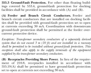 | | | | (A) Shore Power Receptacles. (1) Enclosures. Receptacles intended to supply shore power to boats shall be housed in marine power outlets listed as marinapower outlets or listed for set locations, or shall be installed in listed enclosures protected from the weather or in listed weatherproof enclosures. The integrity of the assembly shall not be affected when the receptacles are in use with any type of booted or nonbooted attachment plug/cap inserted. (4) Ratings. Shore power for boats shall be provided by single receptacles rated not less than 30 amperes. (a) Receptacles rated 30 amperes and 50 amperes shall be of the locking and grounding type. (b) Receptacles rated 60 amperes or higher shall be of the pin and sleeve type. (B) Other Than Shore Power. En todo el 555-19 cambiar "orilla" por "costa". En 1) de a) cambiar "listadas" por "aprobadas", este es el término correcto. En (a) de 4) de a) cambiar "puesto" por "puesta", "grounding" es "puesta a tierra", "grounded" es "puesto a tierra". En (b) de 4) de a) cambiar "con varilla de guía y manga" por "perno y funda". | |