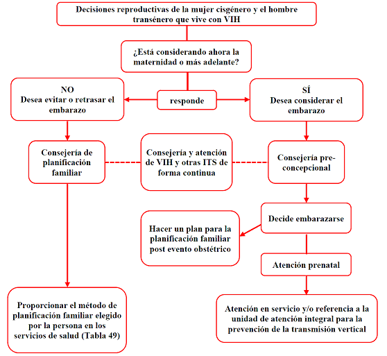 | Salud sexual y reproductiva | Inicio de vida sexual | P | Cada visita | Evaluar ITS, educación sexual Consejería sobre métodos de reproducción, consejería sobre anticoncepción. Ver: Algoritmo 1 y Tabla 49 Se recomienda proveer servicios de notificación asistida en caso de ser necesario. Ver: Guía para la detección del VIH. |