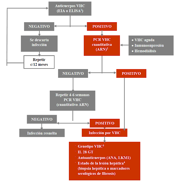 | 1 Los antiHCV pueden ser detectados en el suero o plasma mediante inmunoensayos. La especificidad de las EIA actuales es mayor a 99%. Los resultados falso negativos pueden ocurrir en el contexto de inmunosupresión severa, los receptores de trasplante de órganos o en pacientes en hemodiálisis. Un resultado positivo no descarta infección activa. 2 La reacción en cadena de la polimerasa (PCR) tienen en la actualidad una especificad de entre 98 y 99%. Es importante utilizar la misma prueba para el diagnóstico y seguimiento del tratamiento. No existe formula estándar de factor de conversión de la cantidad de RNA-VHC expresada en copias/ml, a la cantidad expresada en UI/ml (1 a 5 copias de RNA-VHC por UI/ml). 3 El genotipo es útil para predecir la posibilidad de respuesta y determinar la duración óptima de la terapia. El virus C se puede clasificar en al menos 6 genotipos (genotipos 1 a 6) El genotipo 1 (subtipos 1a y 1b) es el más común en América del Norte. 4 Razones para realizar una biopsia hepática: A) Información sobre el estado actual de la lesión hepática. B) Útil en la decisión de iniciar la terapia. C) Puede evaluar fibrosis avanzada o cirrosis que requiere vigilancia para el carcinoma hepatocelular. Existen varios métodos de marcadores serológicos de fibrosis como FibroScan o el Índice FIB4, el cual se calcula con la siguiente fórmula: Edad x AST/plaquetas x ALT (1/2) |