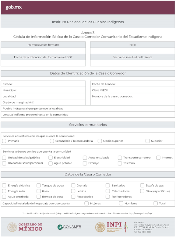c) Casa Comunitaria del Estudiante Indígena. En estas Casas se brinda hospedaje, alimentación y actividades complementarias a los estudiantes indígenas. El hospedaje es proporcionado por la instancia que administra la Casa. El INPI aporta los insumos para la preparación de alimentos, artículos de higiene personal y actividades complementarias para los beneficiarios. Estos espacios son administrados y operados por instancias comunitarias y, en algunos casos debidamente justificados, instancias municipales y estatales.