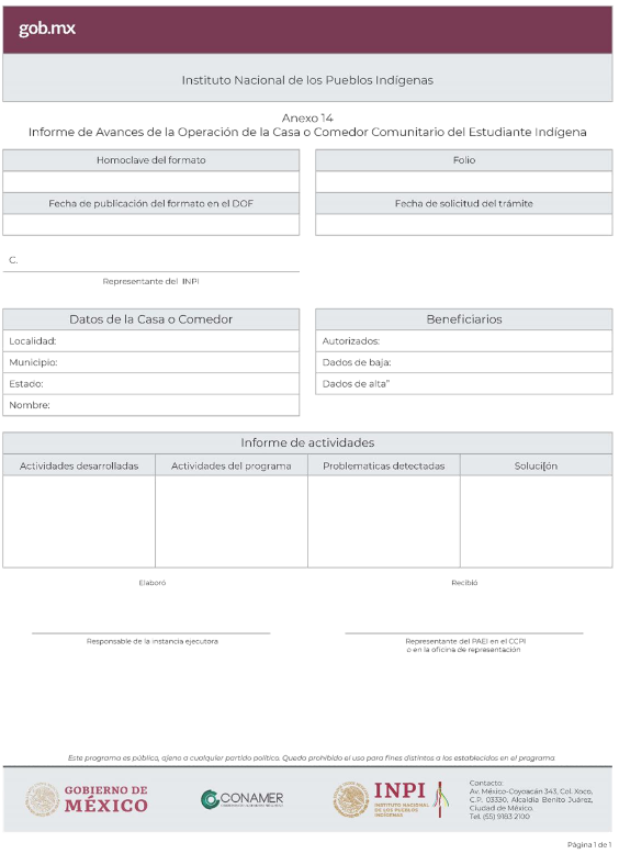 | | PROGRAMA DE APOYO A LA EDUCACIÓN INDÍGENA ANEXO 14 INFORME DE AVANCES EN LA OPERACIÓN DE LA CASA O COMEDOR COMUNITARIO DEL ESTUDIANTE INDÍGENA |