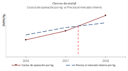 147. Al comparar los comportamientos de los costos de operación por kilogramo de cierres de metal vendido (costos de fabricación más gastos operativos) y los precios de venta al mercado interno de la mercancía similar (expresados en pesos), la Secretaría observó que durante el periodo investigado los costos de operación unitarios aumentaron 17%, mientras que los precios por kilogramo al mercado nacional si bien tuvieron un crecimiento de 5%, se ubicaron por abajo de los costos de operación unitarios en 7%. Durante el periodo analizado, los costos de operación unitarios aumentaron 30% mientras que los precios de la mercancía similar de fabricación nacional por kilogramo vendidas en el mercado nacional crecieron 14%. Lo anterior, indica que la Solicitante se vio orillada a contener el crecimiento de sus precios durante el periodo analizado para hacer frente a las condiciones de competencia de las importaciones investigadas, en un contexto donde los costos unitarios crecieron, por lo que existen elementos suficientes que sustentan que la rama de producción nacional enfrenta una situación de deterioro.