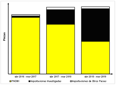81. En términos del mercado nacional, la Secretaría observó que las importaciones investigadas incrementaron su participación en relación con el CNA y la PNOMI. Respecto al CNA, dichas importaciones representaron 3% en el periodo abril de 2016-marzo de 2017, 22% en el periodo abril de 2017-marzo de 2018 y 49% en el periodo investigado, tal como se observa en la siguiente gráfica, mientras que, respecto a la PNOMI, representaron 3% en el periodo abril de 2016-marzo de 2017, 29% en el periodo abril de 2017-marzo de 2018 y 100% en el periodo investigado. Asimismo, las importaciones de otros orígenes representaron 2% del CNA en el periodo abril de 2016-marzo de 2017, 4% en el periodo abril de 2017-marzo de 2018 y 3% en el periodo investigado, mientras que, respecto a la PNOMI, representaron 2% en el periodo abril de 2016-marzo de 2017, 5% en el periodo abril de 2017-marzo de 2018 y 6% en el periodo investigado. Adicionalmente, y con base en las cifras existentes en el expediente administrativo, la Secretaría confirmó el argumento señalado por Tamer, relativo a que, durante el periodo analizado, la empresa Truper dejó de fabricar GHB en México para convertirse en la principal importadora de la mercancía investigada tanto en el periodo abril de 2017-marzo de 2018 como en el periodo investigado.