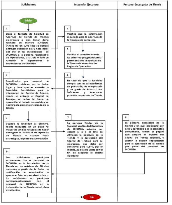 | Que en localidades que cumplan con lo establecido en las presentes Reglas, exista interés en la instalación de una tienda y que las y los solicitantes estén de acuerdo en aportar el local. | Enviar Solicitud de Apertura de Tienda ingresando al Portal Único del Gobierno disponible en https://www.gob.mx/tramites, a la cual podrá también acceder desde la página de DICONSA (http://www.gob.mx/diconsa). En caso de no contar con acceso a internet, una o un representante de la comunidad interesada podrá entregar a DICONSA la Solicitud de Apertura de Tienda (Anexo II), la cual deberá ser suscrita por al menos quince jefes o jefas de familia. La solicitud podrá enviarse a la Dirección de Operaciones de DICONSA, ubicada en Avenida Insurgentes Sur 3483, Ala Sur, Colonia Villa Olímpica Miguel Hidalgo, Alcaldía de Tlalpan, C.P. 14020, Ciudad de México, o entregarse en las instalaciones de DICONSA (sucursales, unidades operativas, almacenes) en el interior del país, de conformidad con la normatividad establecida por la Dirección de Operaciones de Diconsa. |