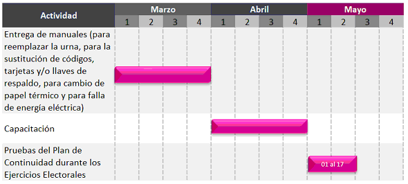 El numeral 11 de los Lineamientos establece que a fin de determinar las estrategias, procedimientos y acciones necesarias para garantizar la emisión del sufragio, en caso de que se presente alguna eventualidad durante cualquiera de las etapas del Modelo de Operación, tales como el daño físico, problemas de funcionamiento o el robo de las urnas electrónicas, entre otras, la DEOE, UNICOM, DECEyEC, DERFE y UTVOPL, deberán presentar a este Consejo General el programa de implementación de un Plan de Continuidad, considerando como mínimo los siguientes aspectos: