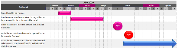 El Plan contempla una etapa de análisis de riesgos que permitirá identificar, evaluar, controlar y dar seguimiento oportunamente a los riesgos detectados, se tiene previsto que la UNICOM, DEOE, DECEYEC, DERFE, UTVOPL y los OPL de Coahuila, Jalisco e Hidalgo, lleven a cabo dicha etapa dentro de los 15 días naturales siguientes a la aprobación del Plan de Seguridad.