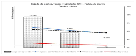 174. En suma, la Secretaría observó un desempeño negativo en el periodo investigado de las siguientes variables financieras asociadas con las ventas totales: los ingresos por ventas disminuyeron 16%, los resultados operativos disminuyeron 100% y el margen operativo se deterioró 5.48 puntos porcentuales. En el periodo analizado, igualmente se observó un descenso de dichas variables de 31%, 100% y 11.29 puntos porcentuales, respectivamente.