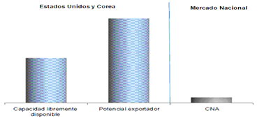 Mercado nacional vs capacidad libremente disponible de Estados Unidos y de Corea (Toneladas
