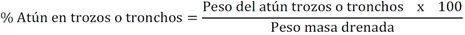 b) Expresar el peso del atún en trozos o tronchos retenido en la criba mediante una resta y exprésese como porcentaje del peso masa drenada.