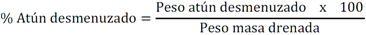 d) Expresar el peso del atún desmenuzado como porcentaje (%) de la masa drenada.