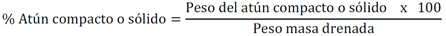 a) Expresar el peso del atún compacto o sólido retenido en la criba mediante una resta y expresarlo como porcentaje (%) del peso masa drenada.