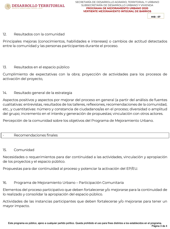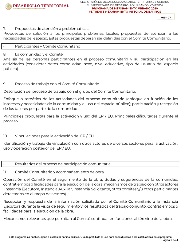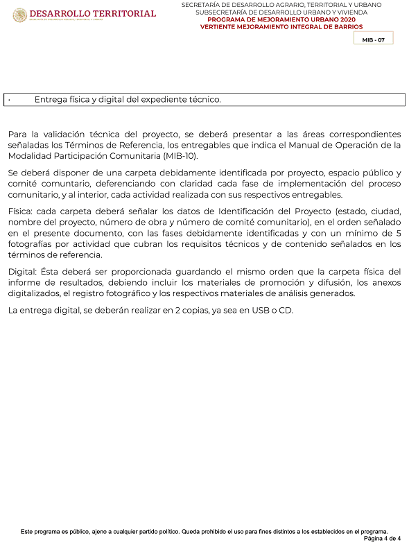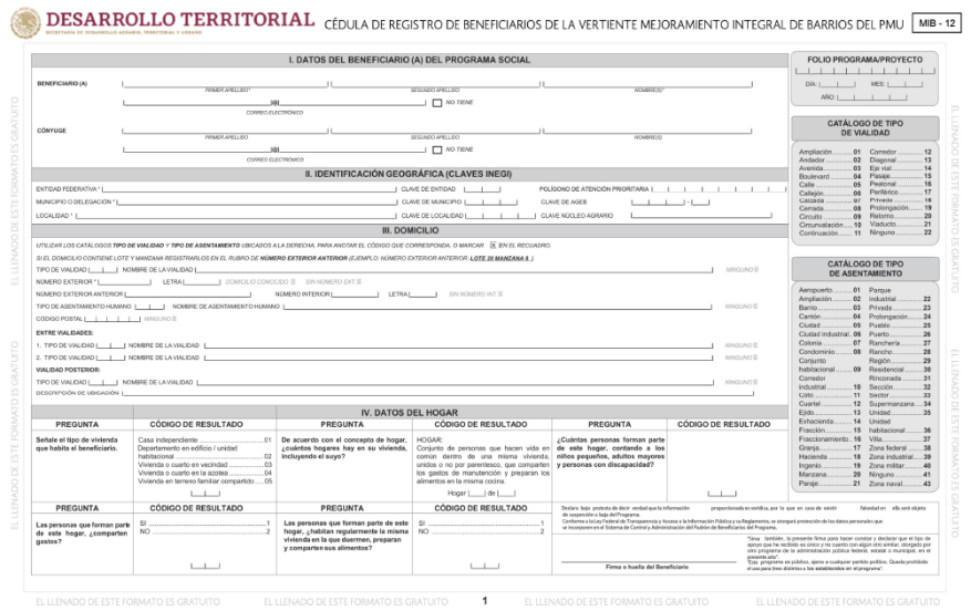 La Instancia Solicitante, con Apoyo de la Instancia Auxiliar aplicará la Cédula de registro de beneficiarios de la Vertiente Mejoramiento Integral de Barrios (MIB-12), disponible en el micrositio del Programa: http://mimexicolate.gob.mx/; conforme la apertura programática (PMU-04) y a la naturaleza de cada proyecto.