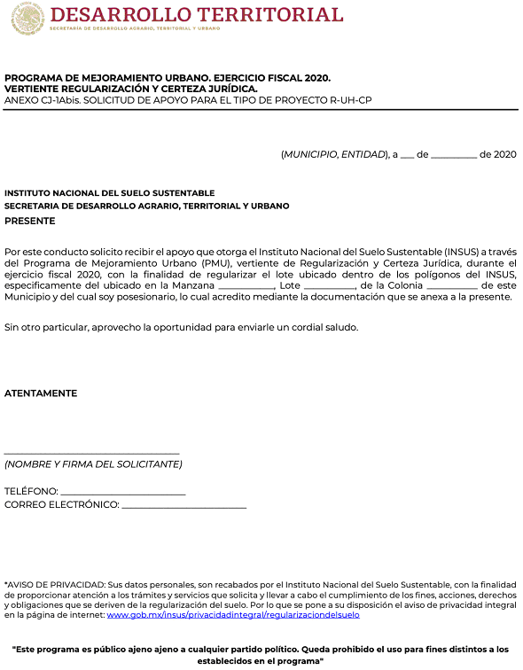 i. Una vez definidos los municipios a intervenir por el Programa, presentar la Solicitud de Apoyo para el Tipo de Proyecto R-UH-CP (Anexo CJ-1A-Bis) de la Vertiente de Regularización y Certeza Jurídica, ante la Instancia Ejecutora del INSUS en la Entidad Federativa correspondiente, para iniciar y/o continuar los procesos de regularización. Ninguna persona puede ser beneficiada para la regularización de más de un lote. El anexo se encuentran disponible para consulta en las presentes Reglas de Operación y en el micrositio del Programa: http://mimexicolate.gob.mx/;