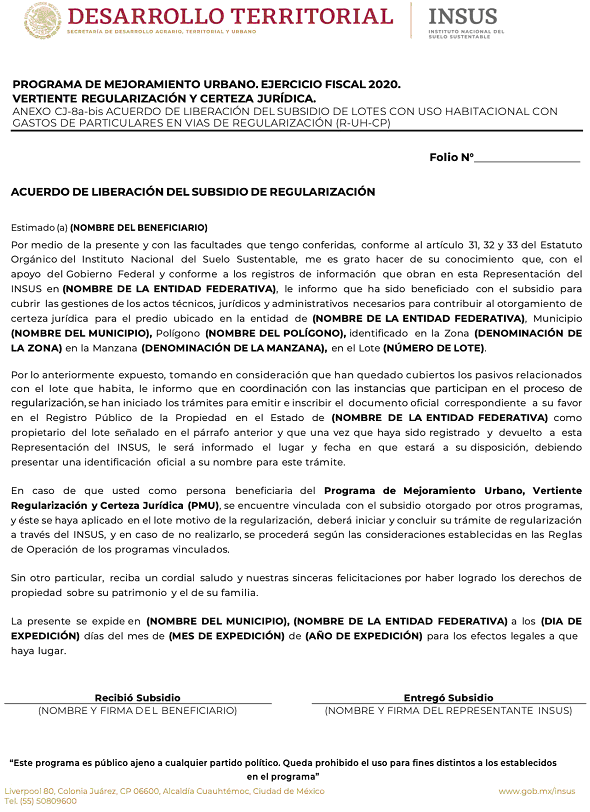 ANEXO CJ-CJ-8.A-BIS.ACUERDO DE LIBERACIÓN DEL SUBSIDIO DE REGULARIZACIÓN