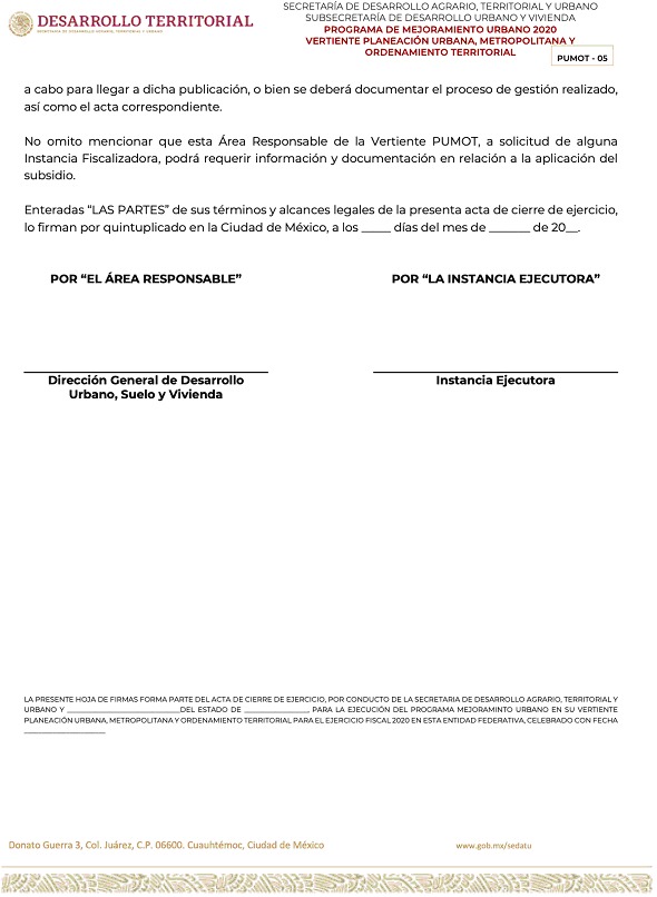 La Instancia Ejecutora, integrará el cierre de ejercicio y lo remitirá al Área Responsable dentro de los quince días naturales después del cierre del ejercicio fiscal, impreso y en medio magnético, así como la comprobación del gasto mediante documentación oficial. La Instancia Ejecutora deberá complementar y firmar el Formato Cierre de Ejercicio (PUMOT-05), del proyecto concluido el cual puede ser consultado en el micrositio del Programa: