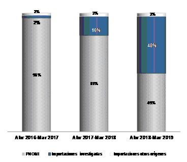 y el periodo investigado, y aumentaron su participación en el CNA en 46 puntos porcentuales, al pasar de una contribución de 2% en el periodo abril de 2016-marzo de 2017 a 48% en el periodo investigado. En relación con el volumen de la producción nacional, representaron 2% y 87% en los mismos periodos, respectivamente. En razón de ello, las importaciones investigadas aumentaron su participación en las importaciones totales en 41 puntos porcentuales, al pasar de una contribución de 54% en el periodo abril de 2016-marzo de 2017 a 95% en el periodo investigado.