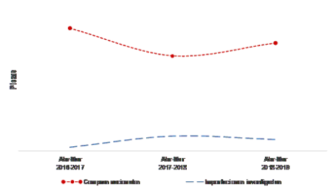 115. Por otro lado, en el contexto del comportamiento del CNA ocurrido en el periodo analizado y señalado en el punto 78 de la presente Resolución, la producción nacional orientada al mercado interno de la rama de producción nacional disminuyó su participación en el CNA en el periodo analizado en 11 puntos porcentuales, al pasar de representar 59% en el periodo abril de 2016-marzo de 2017 al 48% en el periodo abril de 2017-marzo de 2018 y en el periodo investigado.