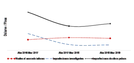 105. Por otro lado, con base en la información obtenida de las cifras de ventas al mercado interno de la rama de producción nacional, la Secretaría observó que el precio promedio de las ventas internas de la mercancía fabricada por Tamer medido en dólares, registró un incremento de 19% en el periodo abril de 2017-marzo de 2018 y una caída de 5% en el periodo investigado, acumulando un crecimiento de 13% en el periodo analizado. Asimismo, al compararlos con el precio de las importaciones investigadas (el cual incluye los gastos incrementables), éstos se ubicaron 56% por arriba del precio nacional en el periodo abril de 2016- marzo de 2017, pero 55% por debajo del mismo en los periodos abril de 2017-marzo de 2018 y el investigado, tal como se observa en la gráfica siguiente.