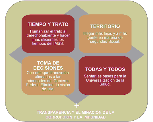 | TRANSPARENCIA Y ELIMINACIÓN DE LA CORRUPCIÓN Y LA IMPUNIDAD | Objetivo 5 Asegurar la sostenibilidad con un gasto eficiente y una mayor recaudación, siempre privilegiando la austeridad y la eliminación de la corrupción y la impunidad. | Un IMSS sin corrupción; un IMSS transformado para futuras generaciones. | |