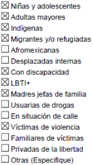 | En el caso de atender a población de mujeres, ¿El proyecto va dirigido para uno o varios grupos en mayor situación de vulnerabilidad? Seleccionar todas las opciones que coincidan | | | |