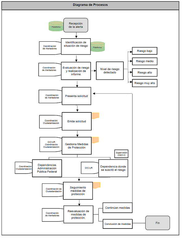 Propone a la Coordinación General de Ciudadanización, la solicitud ante las autoridades competentes, de las medidas de protección que estime pertinentes; brinda asesoría y acompañamiento a las personas alertadoras; realiza la evaluación y revaluación de riesgo; somete el resultado de la evaluación de riesgo y las medidas de protección requeridas a la Coordinación General de Ciudadanización y Defensa a Víctimas de la Corrupción; contribuye con la implementación de medidas de protección de índole individual; notifica a la persona alertadora las medidas a implementar y las instancias encargadas de brindarlas; verifica que las medidas implementadas se ejecuten de manera adecuada; propone a la Coordinación General de Ciudadanización la celebración de convenios y demás instrumentos de coordinación, colaboración y concertación con las dependencias de la administración pública federal.