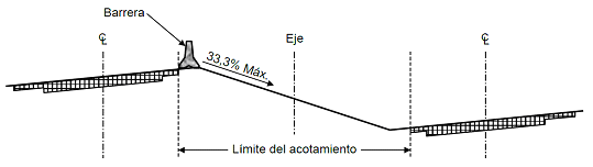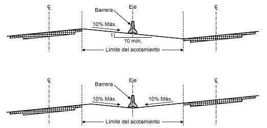 Son dispositivos de seguridad flexibles, semirrígidos o rígidos que se colocan en caminos divididos para separar un arroyo vial de otro con flujo vehicular en sentido opuesto, con el propósito de impedir que algún vehículo abandone su arroyo vial e invada el otro, ya sea por condiciones meteorológicas, por fallas mecánicas o de conducción o por características específicas del camino. Quedan comprendidas dentro de esta definición, las barreras que se utilicen para separar carriles en el mismo sentido de circulación y las que sean móviles mediante un dispositivo especial, para abrir y cerrar carriles reversibles o habilitar carriles de emergencia por accidentes. Ocasionalmente pueden ser usadas para evitar el acceso de vehículos por sitios indebidos a carriles restringidos. Son concebidas para recibir impactos por ambos lados.