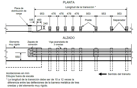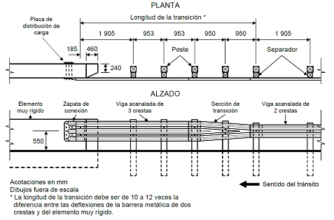 Barreras de orilla de corona o separadoras de sentidos de circulación, con arreglos y configuraciones particulares, que se colocan para conectar dos barreras comunes con niveles de contención o deflexión dinámica diferentes, o entre las barreras comunes y los parapetos de puentes o de estructuras similares, o entre aquellas y cualquier elemento lateral rígido como muros de contención y muros de entrada a túneles, entre otros, para lograr la transición progresiva del nivel de contención y la deflexión dinámica de las primeras al de los segundos, tanto en las aproximaciones como en las salidas de esas estructuras, con el propósito de evitar la deformación exagerada que resulta en ángulos excesivos de redireccionamiento con trayectorias peligrosas, el impacto de los vehículos en los elementos rígidos de las estructuras, con la consecuente desaceleración excesiva o la penetración de las barreras en los vehículos impactados a lo largo de la transición.
