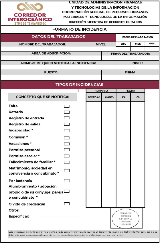IX. Incidencia: Formato a través del cual se documentan eventos que de no justificarse puedan dar lugar a deducciones del salario, así como el control de vacaciones, permisos especiales, asuntos personales, comisiones, entre otros (ANEXO 1);