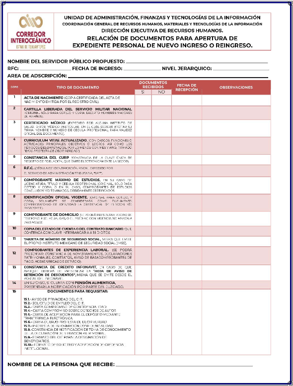Artículo 9.- Para ingresar a laborar al Corredor y para que la Coordinación General integre el expediente respectivo, la persona solicitante deberá cumplir con los requisitos establecidos en el formato denominado Relación de Documentos para apertura de expediente personal de nuevo ingreso o reingreso (ANEXO 2).