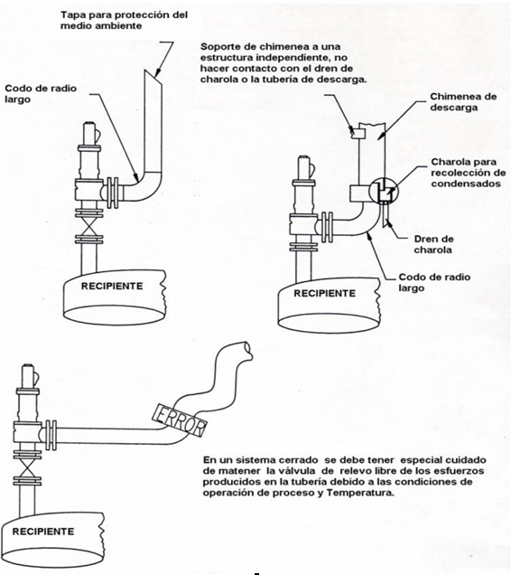 | | | | | | L6.4 Toda línea de descarga debe correr tan directamente como sea posible hacia el punto de descarga final. Para líneas de longitudes mayores se debe proporcionar la debida consideración a la ventaja que representa el uso de codos de radio amplio, evitando instalar conectores muy cercanos entre sí y minimizando restricciones excesivas por juntas de expansión, además de procurar medios de soporte para minimizar bamboleos y vibraciones en la línea bajo las condiciones de operación. L6.5 En todos los casos, se debe proveer a la(s) línea(s) de descarga con drenajes adecuados. Nota: Es importante reconocer la imposibilidad de aplicar una regla general para los variados requisitos de instalación, que van desde cortas líneas de descarga dirigidas directamente hacia la atmósfera, hasta sistemas de tubería donde la cantidad y velocidad de producto que debe ser desechado requiere dirigirse a un lugar seguro distante. | | |