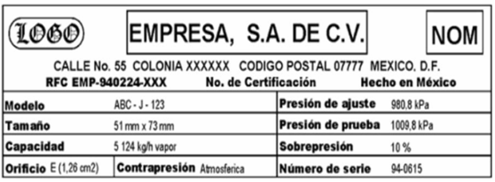 | | | | | | | Cada VRP debe ser marcada claramente, en idioma español, por el fabricante con al menos los datos siguientes, de manera que éstos no se borren debido al uso. El marcado puede hacerse en alto o bajo relieve, sobre el cuerpo de la válvula y/o en una placa adherida de forma permanente e intransferible al cuerpo de la válvula. a) El nombre o razón social y/o marca oficial, del fabricante. b) Número de serie. c) Modelo. d) Clasificación de acuerdo con el numeral 4. e) DN y clase a la entrada y salida de la válvula. f) Designación del tamaño del orificio. g) Fluido de desfogue. h) Capacidad de desfogue (vapor kg/h, agua m³/h, aire m³/s). i) Presión de ajuste (múltiplos de Pascales). j) Contrapresión (múltiplos de Pascales) cuando aplique. k) El año de fabricación. l) La designación del país de origen. m) La contraseña oficial NOM, marca oficial del OC y número de registro de certificación. n) La placa de datos debe ser de un material metálico resistente a la corrosión o) Los datos específicos que se requieren en los incisos b), c), d), e), f), g), h), i), j), k) del presente inciso deben hacerse en alto o bajo relieve (ver Anexo 5 Figura ilustrativa 14)." | |